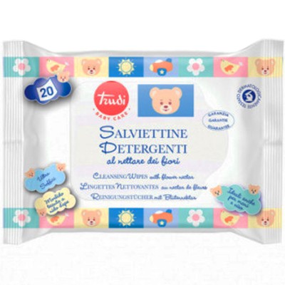 Salviette per il cambio del bimbo di Trudi. Sempre necessarie vicino al fasciatoio e nella borsa da viaggio, le salviettine umidificate Trudi, grazie al loro particolare tessuto in cotone ultra morbido, accarezzano morbidamente il sederino del bebè ad ogni cambio pannolino, lasciando sulla pelle uno strato di leggera emulsione fluida a base di nettare dei fiori. delicate, morbide, dedicate alle pelli sensibili, non contengono allergeni. Confezione da 20 salviette.